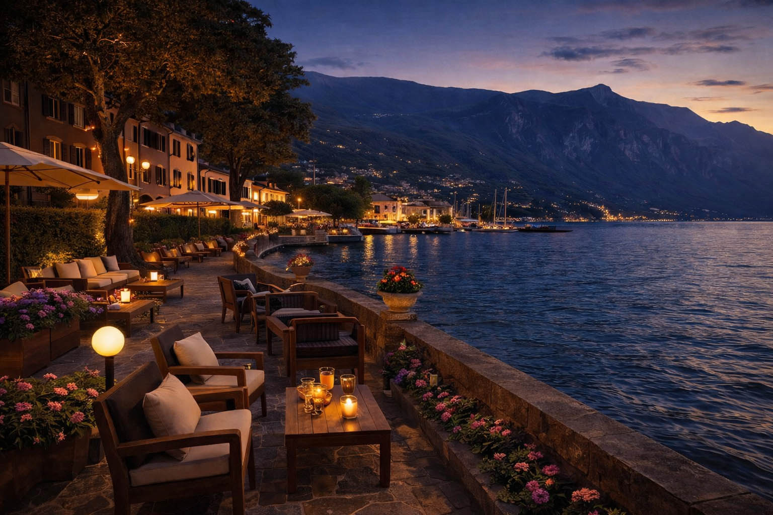 Umgeben von Hügeln, direkt am kristallklaren Wasser: Hier zeigt sich der Gardasee in seiner ganzen Weite — morgens weich, abends golden.